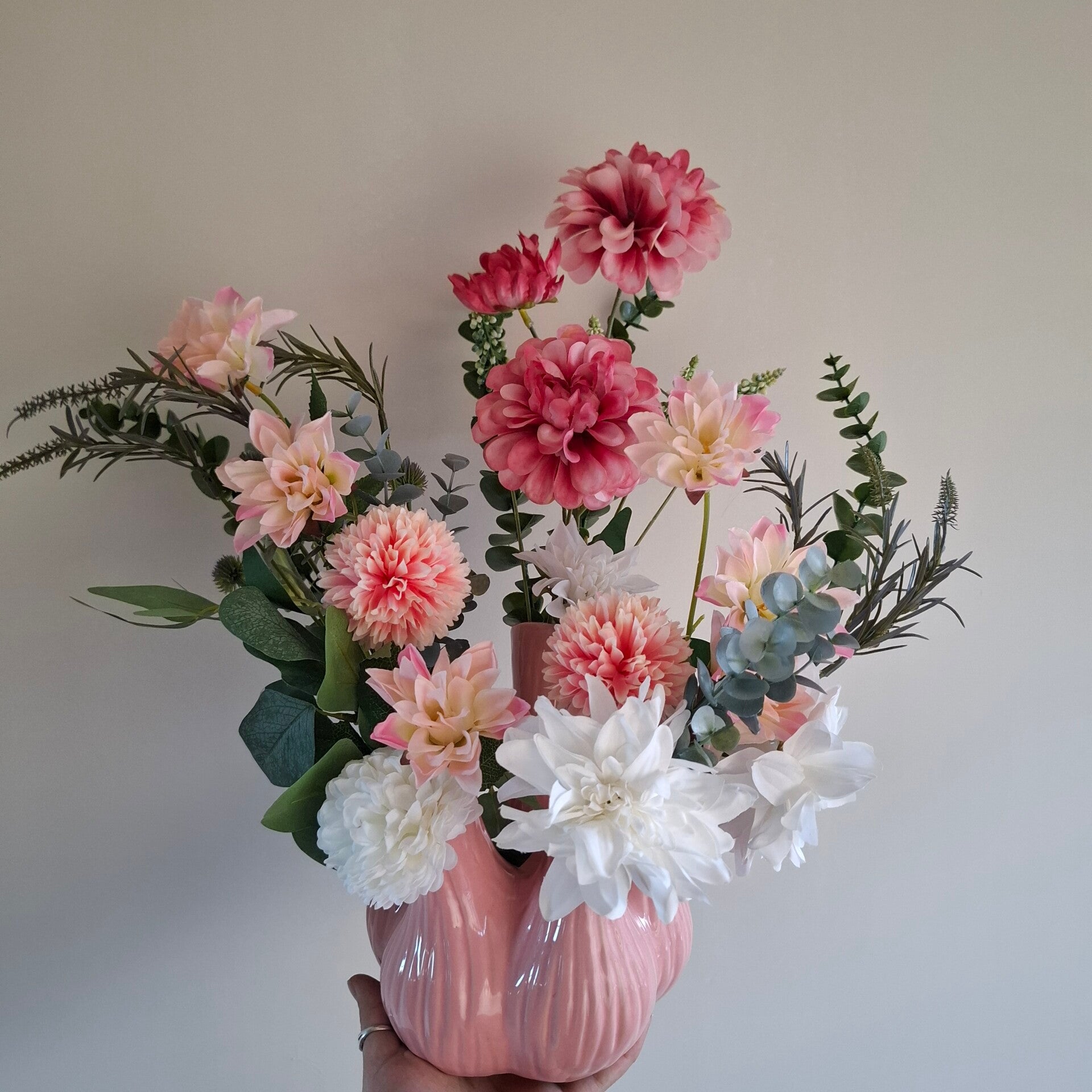 Breng warmte en zachtheid in je interieur met deze elegante roze toetervaas, gevuld met een zorgvuldig samengesteld boeket van luxe zijdebloemen. De combinatie van verschillende roze tinten, frisse witte accenten en speels groen zorgt voor een rustige maar rijke uitstraling.