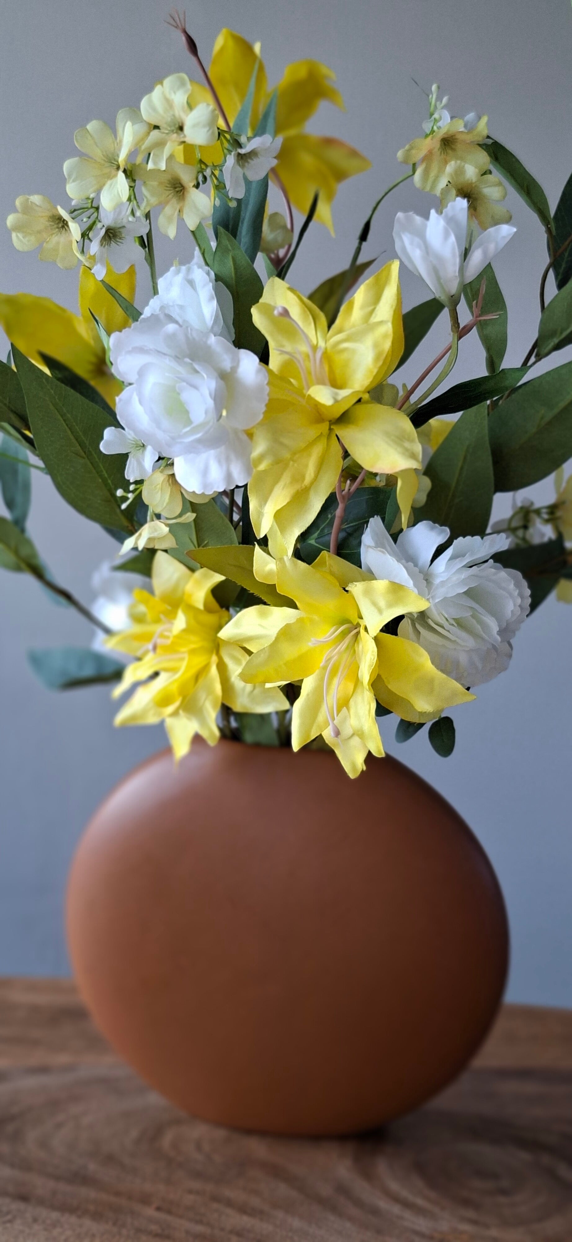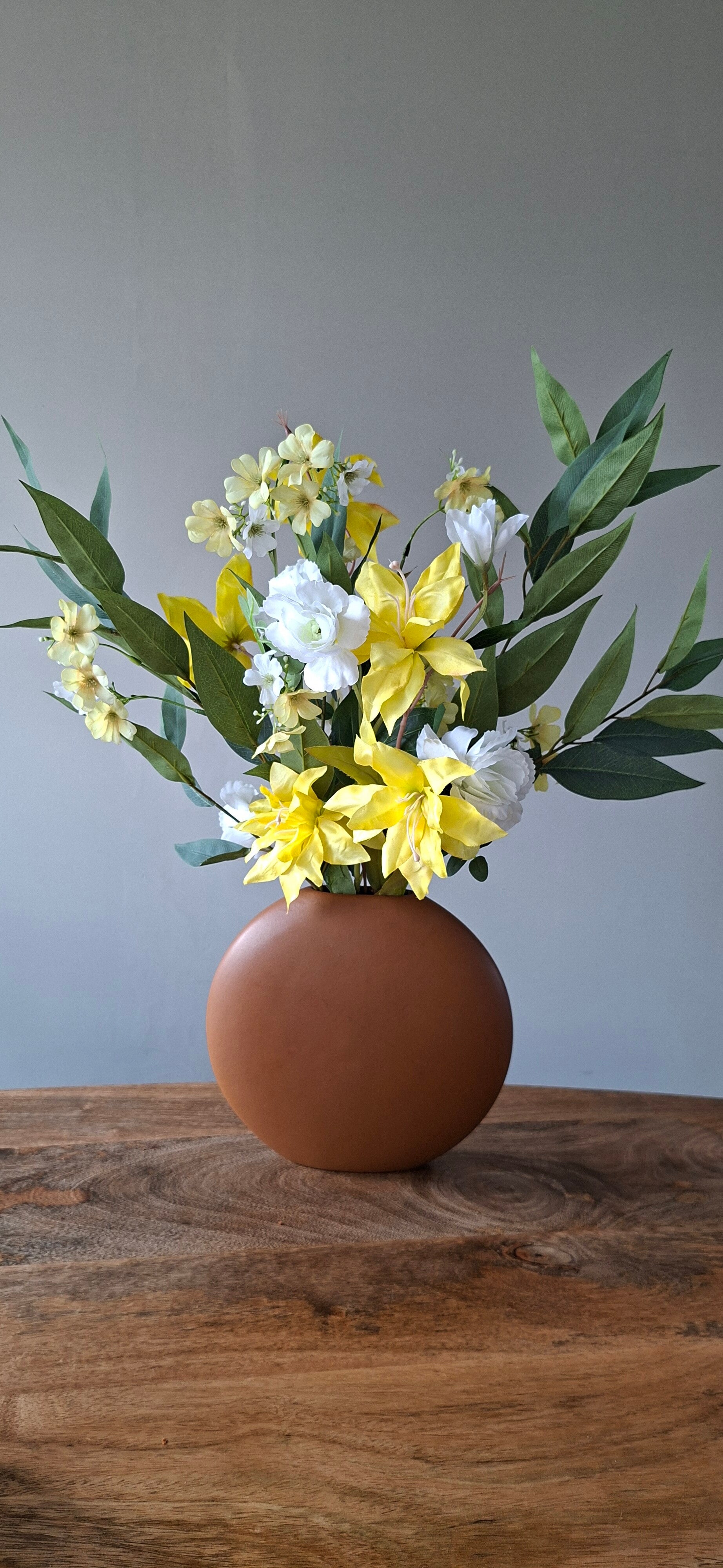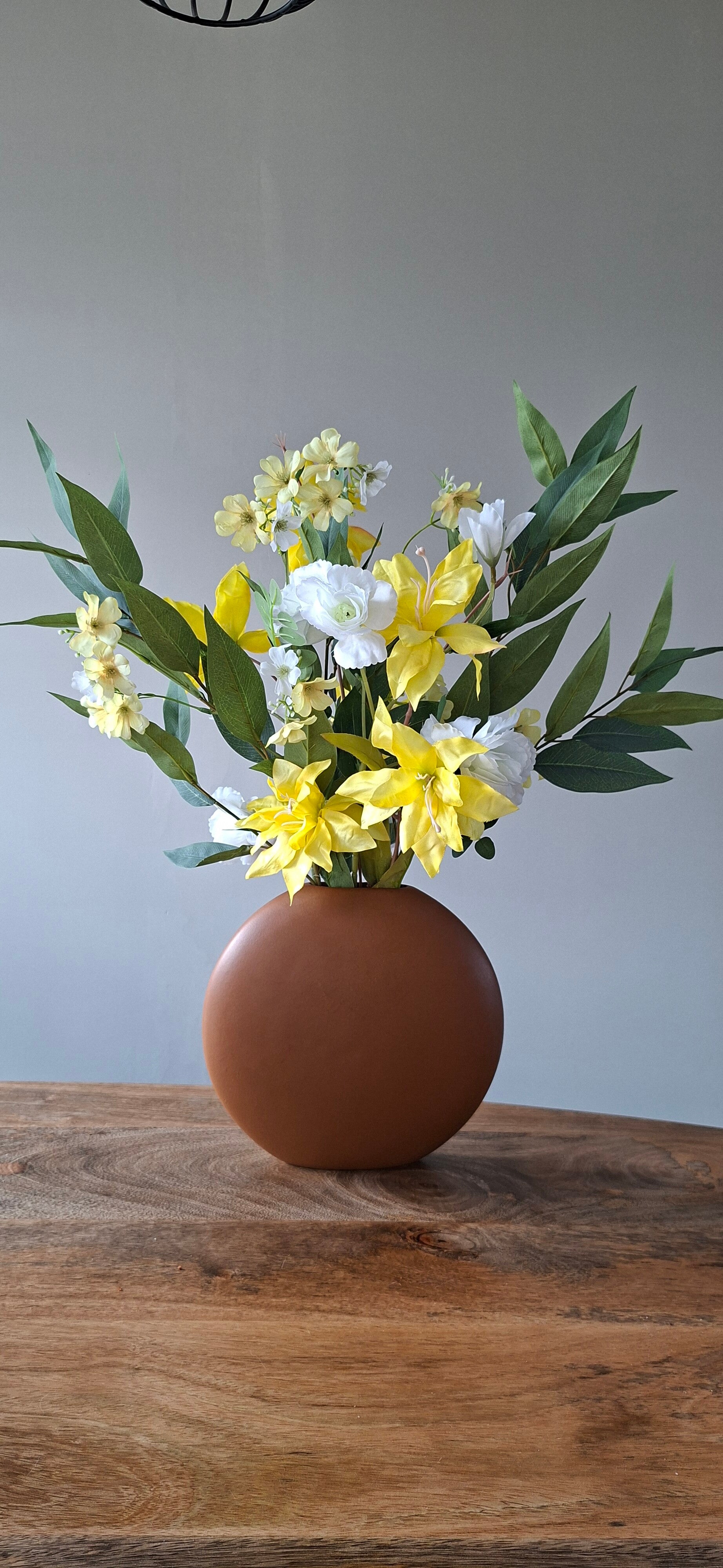 Met de vrolijke gele bloemen in combinatie met de frisse witte bloemen haal je de lente in huis.